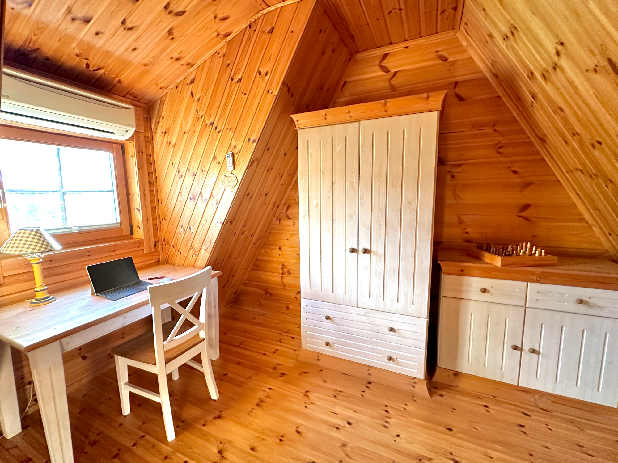 Das offene Erdgeschoss mit Wohnbereich, Küche und Essplatz bildet das Herzstück des Hauses. Im Erdgeschoss befindet sich außerdem das Bad und ein kleines Schlafzimmer. Auf der offenen Galerie gibt es einen weiteren Schlafbereich und einen Arbeitsplatz.